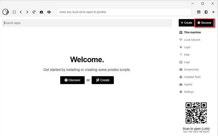 1. После запуска Pinokio нажимаем кнопку «Discover», чтоб открыть страницу поиска доступных для установки приложений.