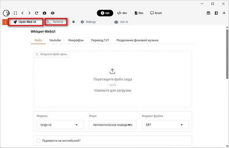 3. После чего откроется вкладка консоли «Terminal» где будет вино процесс загрузки и работы приложения. Если приложение имеет графический интерфейс Web UI для работы с ним, то откроется дополнительная с графическим интерфейсом «Open Web UI».