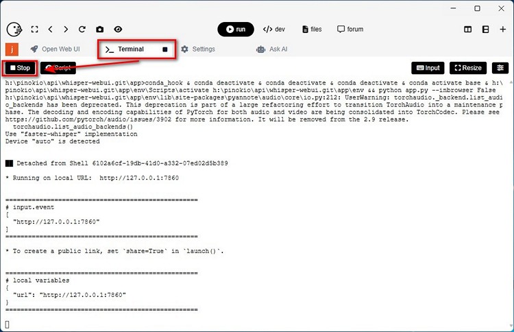Остановка приложения искусственного интеллекта запущенного в в Pinokio