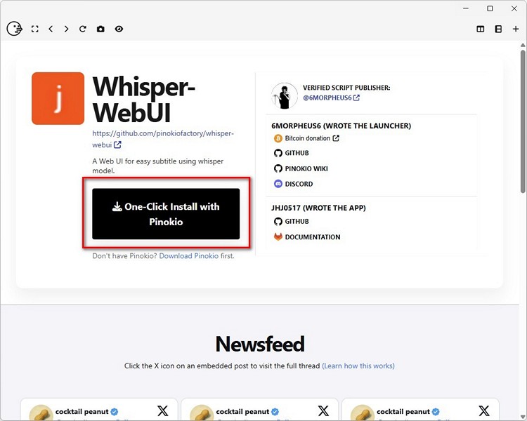 5. В новом окне, которое откроется, нажимаем кнопку «One-Clicl install with Pinokio», чтоб начать процесс установки выбранного приложения.