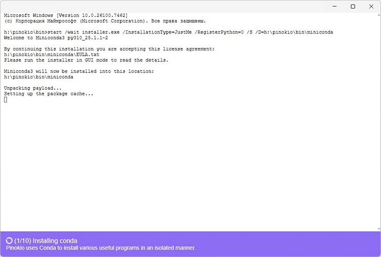 7. Вот тут есть один нюанс. Pinokio запускает все приложения в изолированной среде, перед установкой самого приложения идет проверка наличия всех необходимых пакетов для её работы. Если все нужные пакеты установлены, то этот шаг пропускается, в противном случае до установлены недостающие пакеты.