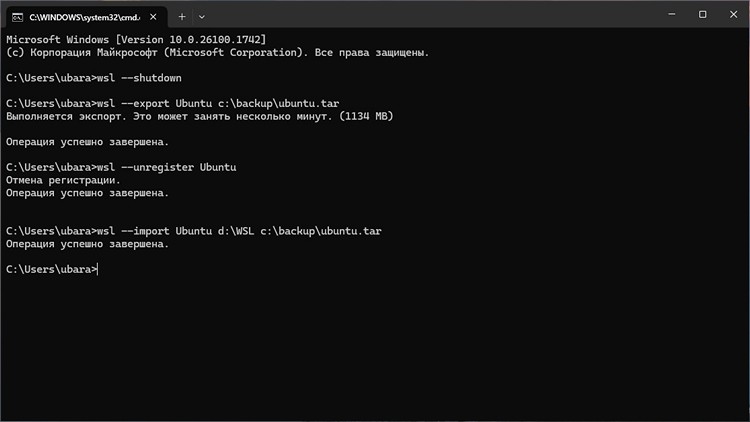 где «distribution» название дистрибьютива Linux, а «location» папка в которую нужно перенести файловую систему WSL.
