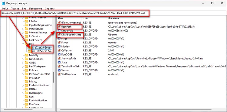 3. Каждый раздел реестра с уникальным индикатором «UUID» (это случайный долинный набор букв и цифр) дистрибьютивов Linux установленных на компьютер. В каждом разделе есть параметр «DistributionName» в котором указано название дистрибьютива Linux, а в «BasePath» указан путь к файловой системе.