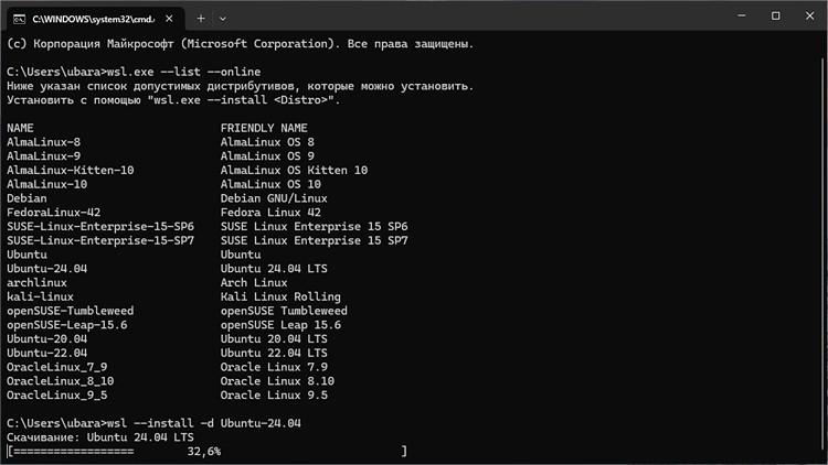 3. Устанавливаем нужный дистрибутив Linux, для чего вводим команду «wsl —install -d distributive», где «distributive» это название дистрибьютива Linux, а флаг «-d» указывает что его нужно использовать по умолчанию.