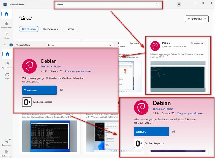 2. Находим нужный дистрибьютив Linux, введя название в поисковой строке. Чтоб увидеть список доступных дистрибьютивов, достаточно ввести «Linux».