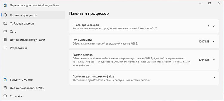 Настройка параметров среды выполнения Windows Subsystem for Linux (WSL) делается с помощью утилиты «WSL Settings» которая запускается из меню Пуск.
