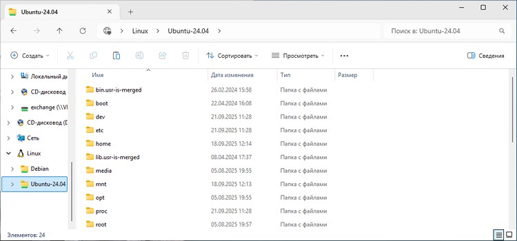 Для каждого виртуального диска установленного дистрибьютива Linux добавляется сетевая папка, к которые можно открыть из Проводника или другого файлового менеджера.