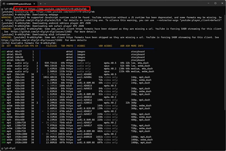 yt-dlp -F https://www.youtube.com/watch?v=N-aK6JnyFmk