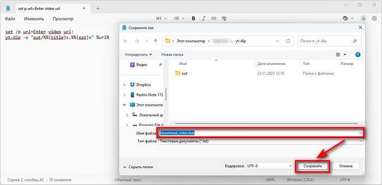Для скачивания видео в папке с исполняемым файлом yt-dlp создаем пакетный файл «download_video.bat» который должен содержать